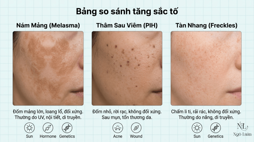Nhưng không phải vết sậm nào cũng là nám mảng. Và không phải “nám” nào cũng cần xử lý giống nhau.