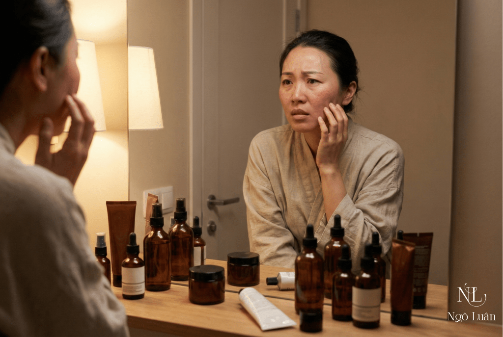 Da không ổn → tăng bước/đổi sản phẩm → da kích ứng nhẹ → lại thêm bước → cuối cùng da yếu và khó phục hồi.